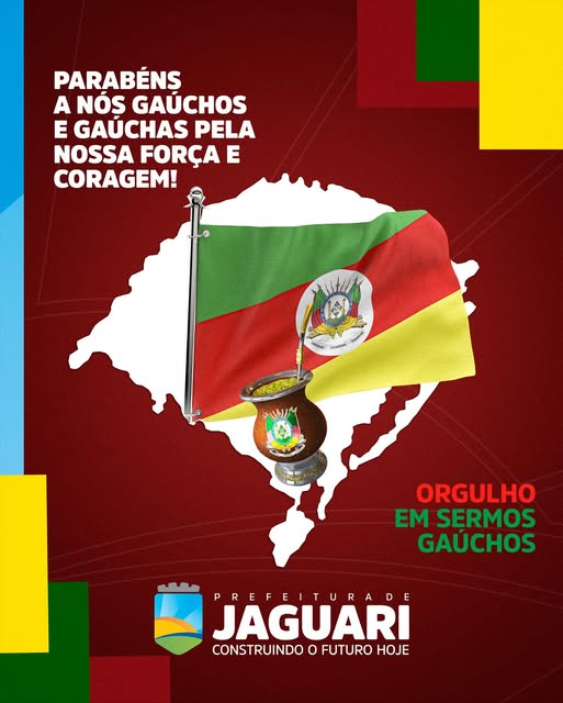 A Prefeitura de Jaguari parabeniza todos os gaúchos e gaúchas que, com orgulho e determinação, preservam as tradições do nosso Rio Grande e ajudam a construir um futuro cada vez melhor. Viva a cultura gaúcha, viva o nosso povo!