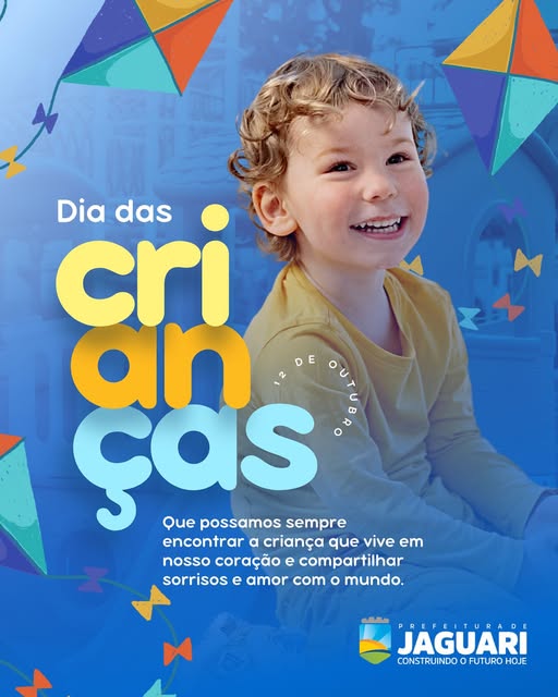 Que nunca faltem motivos para sorrir, brincar e sonhar! A Prefeitura de Jaguari deseja um feliz Dia das Crianças a todos os pequenos que enchem nossa cidade de vida e amor.