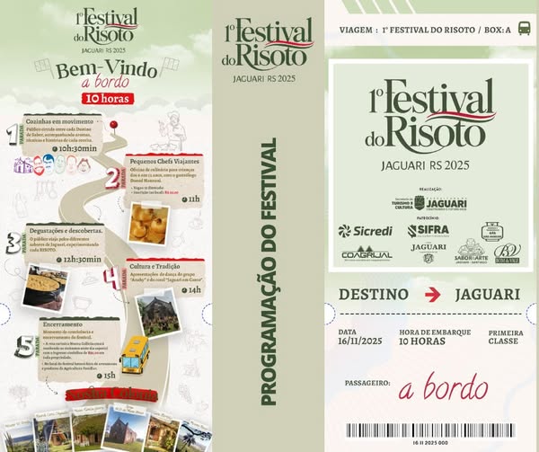 Jaguari viverá um dia especial de sabores, convivência e celebração da cultura local com a realização do 1º Festival do Risoto de Jaguari. O evento, promovido pela Prefeitura Municipal, por meio da Secretaria de Turismo e Cultura, reunirá gastronomia, oficinas, apresentações culturais e vivências, valorizando a identidade e o potencial turístico do município.