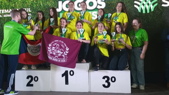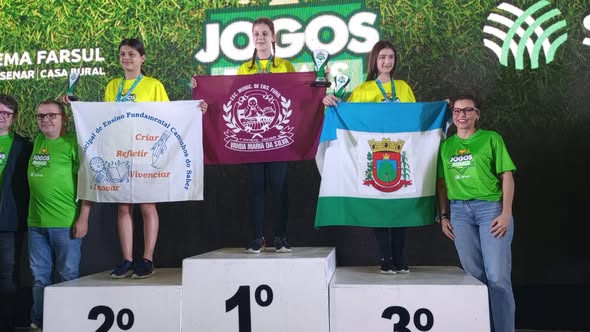 As alunas Eduarda Erd Dvoranovski, Vitória Crestani Baccin, Laisa Pizzani, Yasmin Cioquetta, Bianca Piecha e Amanda Atzler da Escola Municipal Vanda Maria da Silva, do 4º Distrito, conquistaram seis medalhas de ouro nas modalidades de corrida do saco e cabo de guerra, levando o nome da escola e de Jaguari ao pódio.