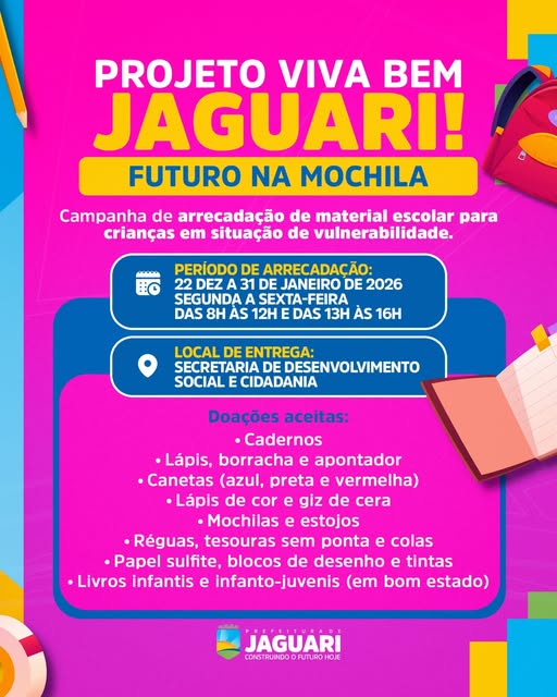 O Projeto Viva Bem Jaguari – Futuro na Mochila é uma campanha solidária de arrecadação de material escolar, voltada a crianças em situação de vulnerabilidade social do nosso município. Com um gesto simples, você ajuda a garantir mais dignidade e incentivo aos estudos para nossas crianças.