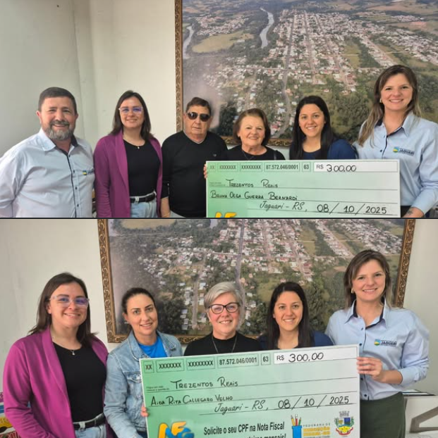 A Prefeitura de Jaguari realizou, na tarde desta quarta-feira, 8 de outubro, mais uma entrega de prêmios do Programa Nota Fiscal Gaúcha (NFG). Nesta edição, as ganhadoras foram Bruna Olga Guerra Bernardi e Aida Rita Callegaro Velho, cada uma contemplada com R$ 300,00.